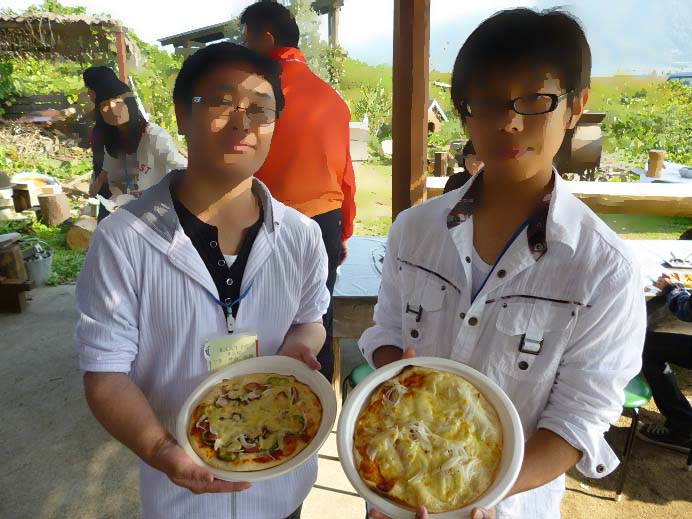 石窯ピザ作り体験では、個性あふれるピザたちが登場し、楽しい昼食になりました。