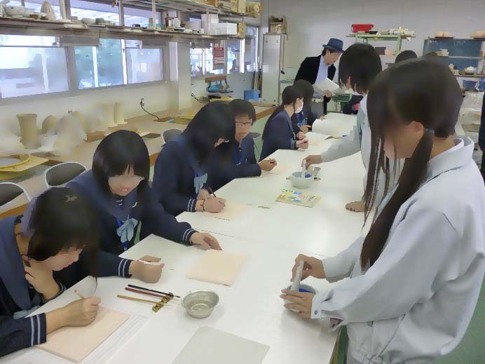 愛媛県の砥部分校との交流では、それぞれの高校紹介と絵付けを行いました。